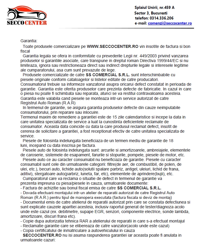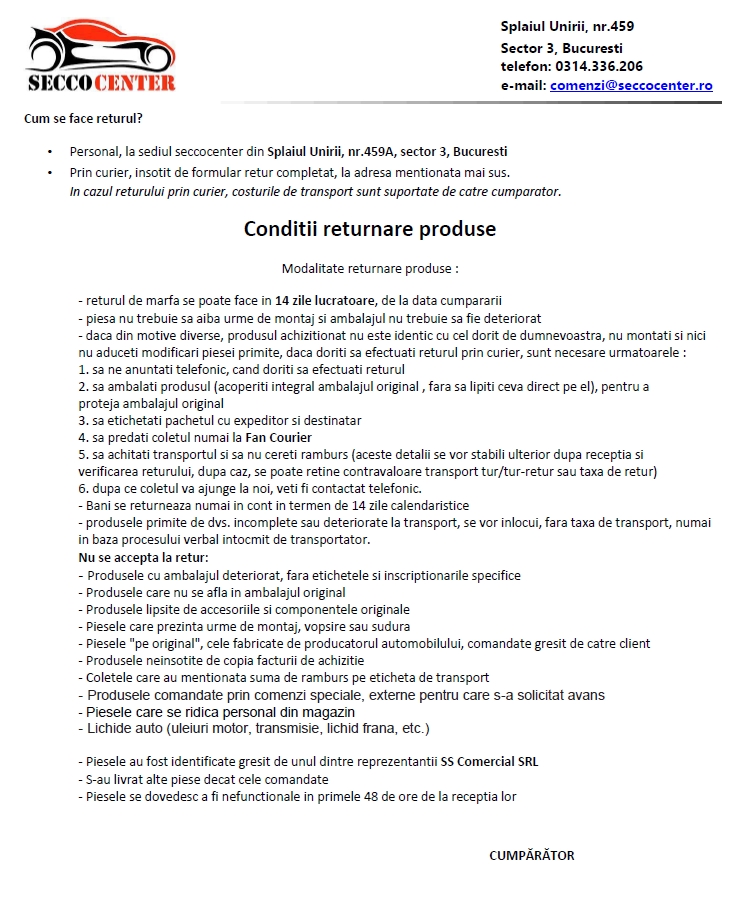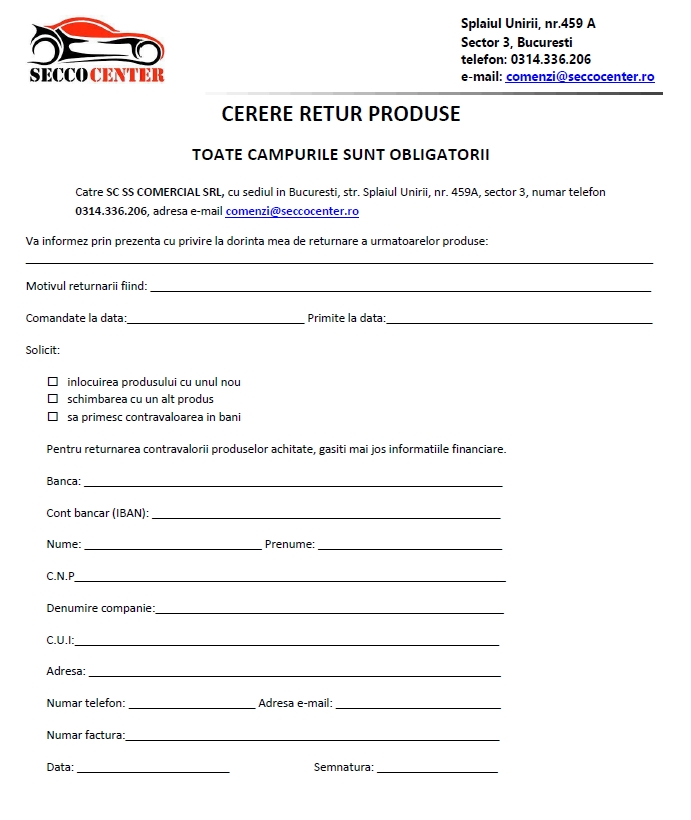 2. Pentru retur, cititi documentul Conditii Retur si daca va incadrati completati cererea de retur si trimiteti-o pe comenzi@seccocenter.ro